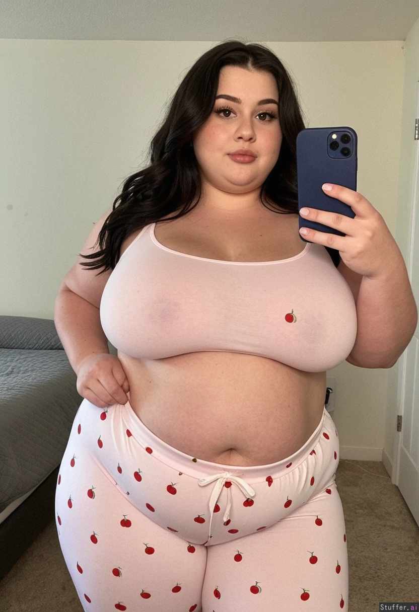 Style: selfie with boyfriend Subject: 21 year old, white wide fat curvy obese Texan girl. Face: Very beautiful, cute face, brown eyes, eyelashes, lip gloss, smooth skin. (Bulging fat double chin: 1.2) Hair: Dark hair, wavy hairstyle, medium length. Body: Massive tits. Bloated, pudgy, noticeably chubby Clothes: (She's wearing tight top and pijama pants. They are light pink with a cherry pattern) Action: Standing straight Localisation: In house
