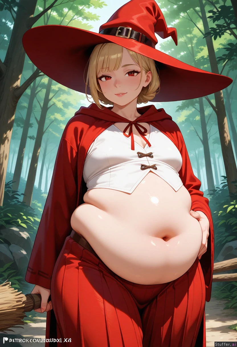 ((1boy)), solo, 8k, beautiful, 4k, high_rating, highres, femboy, bishounen, forest, cliff, red_robes, blonde_hair, red_eyes, ((chubby)), wide_hips, thick_thighs, witch_hat, flat_chested, ((big_belly)), bishounen, mature, potbelly, long_robes, white_vest, long_skirt, red_skirt, bangs