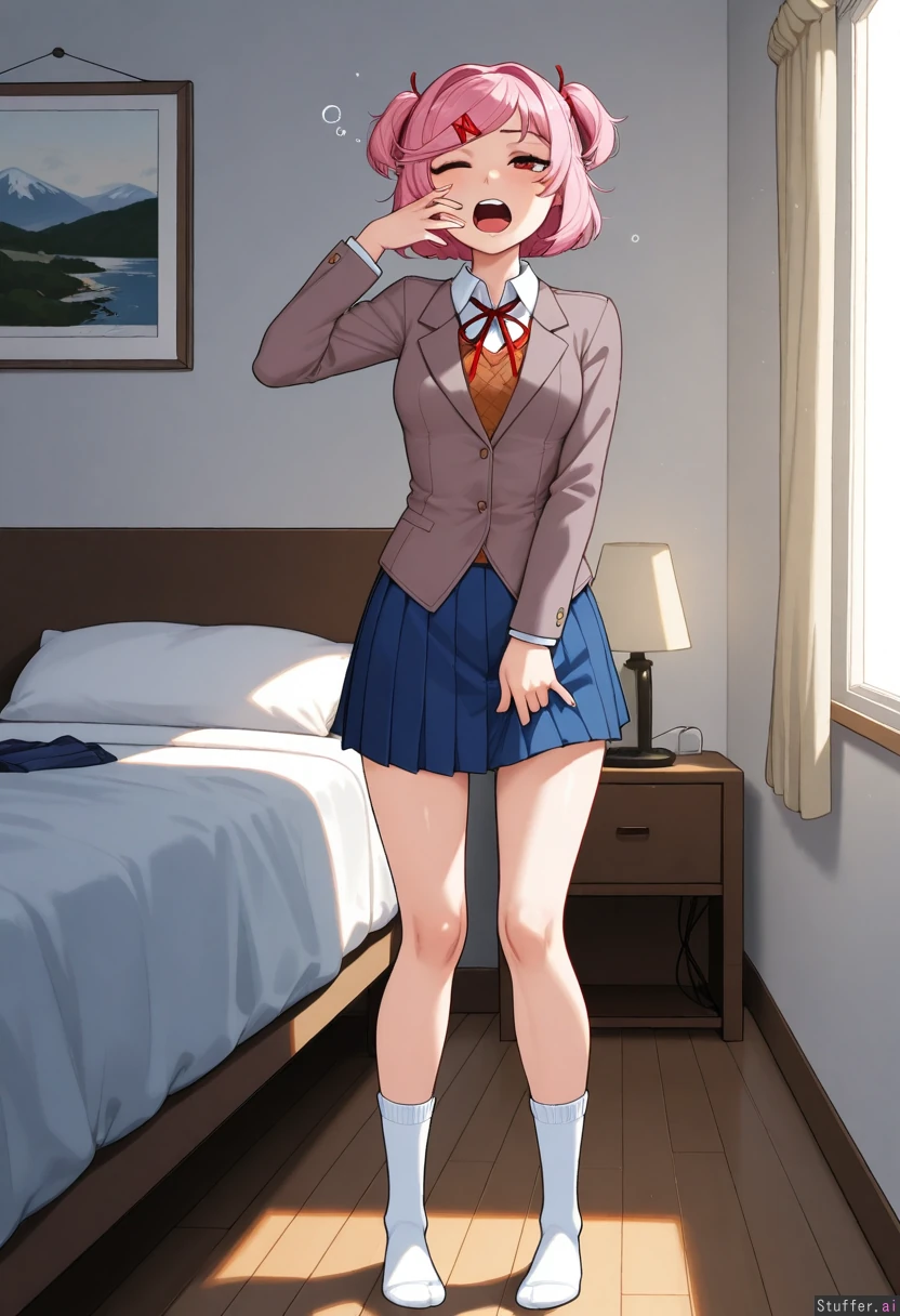 krekkov(artists), KAMII MOMORU(artist) beautiful shading, highly detailed, best quality, perfect anatomy, perfect proportions, perfect lighting, Solo, (adult), (Natsuki from Doki Doki Literature Club) mascara, white socks, uniform, blue skirt Bedroom, morning, pulling on skirt, yawn, sleepy (Skinny body: 1.325), (Thick thighs: 0), (medium breasts:0), (Chubby bloated belly: 0.0), (Bloated belly: 0.0),