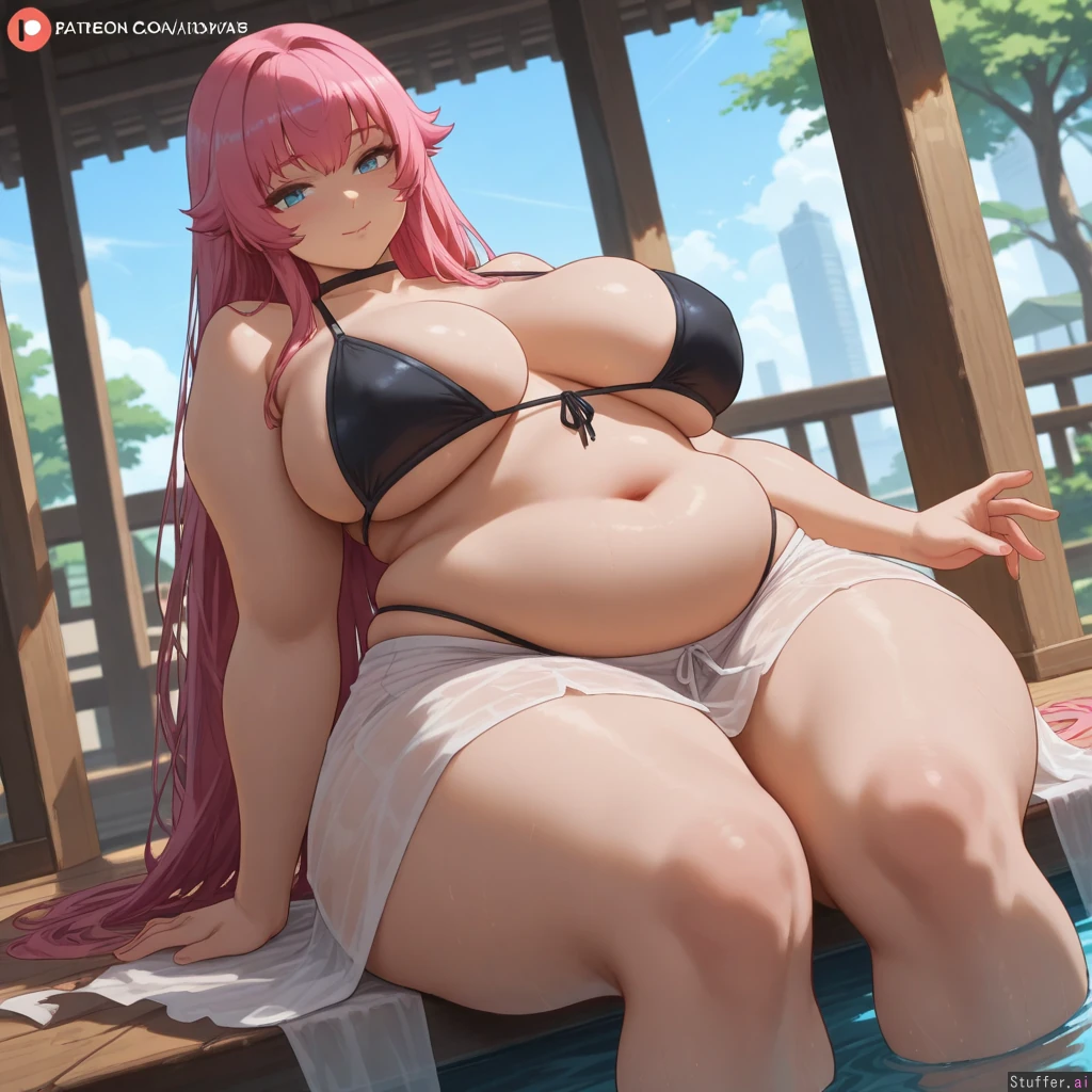 best quality), (high rating), absurd res, high res, detailed, ultra quality, (high quality), masterpiece, stunning beauty, ((((detailed face)))), intricate detail, beautiful face, exquisite detail, absurd resolution, correct anatomy, 8k, high definition picture, (highly detailed face), highly detailed skin texture, detailed background, ((perfect human anatomy)), ((perfect proportions)), skinindentation, shexyo(artist), araneesama(artist), c.cu(artist), cutesexyrobutts(artist), angeltights(artist), jubaby(artist), icecake(artist), jujunaught(artist), Kiyomi(artist), Steelybird(artist), **Character:** ((1girl)). full body, **Body Appearance:** ((Very wide hips:1.6)), bottomheavy, fat rolls, ((large breasts:1.5)), (love handles:1.3), ((large chubby belly:1.3)), (((obese:1.0))), (bulky limbs), ((massive thighs:1.6)), ((massive ass)), ((fat arms:1.5)), ((fat legs:1.6)), (round chubby face:1.6), **Eye:** Blue eyes. **Emotions:** blush, ((horny)), seductive smile, *Hair/Styles:** Long hair, blue and pink hair, Bangs, messy, **Clothes:** Black bikini top, black bikini bottom, yellow see through long skirt **Setting:** Beatch, (day) near water **Actions:** Sitting, sexual pose, looking at viewer, **Perspective::** ((From_side:1 3)),