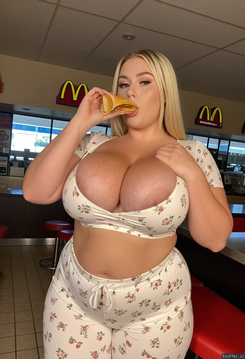 20 year old extremely beautiful white girl, blonde highlights ((wearing matching white with floral pattern summer top and pants)) (((Very Wide hips))) ((Big massive tits)) Curvy Beautiful lighting Stuffing her face in a McDonald's
