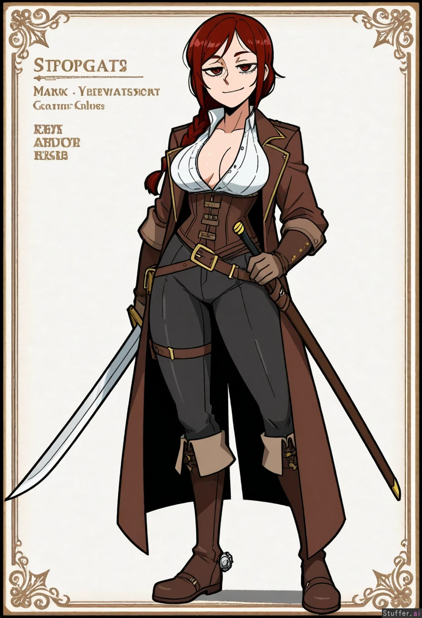 Vanripper, mark gavatino, stopu42 Character concept, simple white background, solo, full body shot, dim colours Fantasy, steampunk, sky pirate, tight white shirt, medium breasts, breasts apart, sword, pistol, greatcoat, Mature woman, mond blond braided hair, beautiful, elegeant facial features, smug, proud