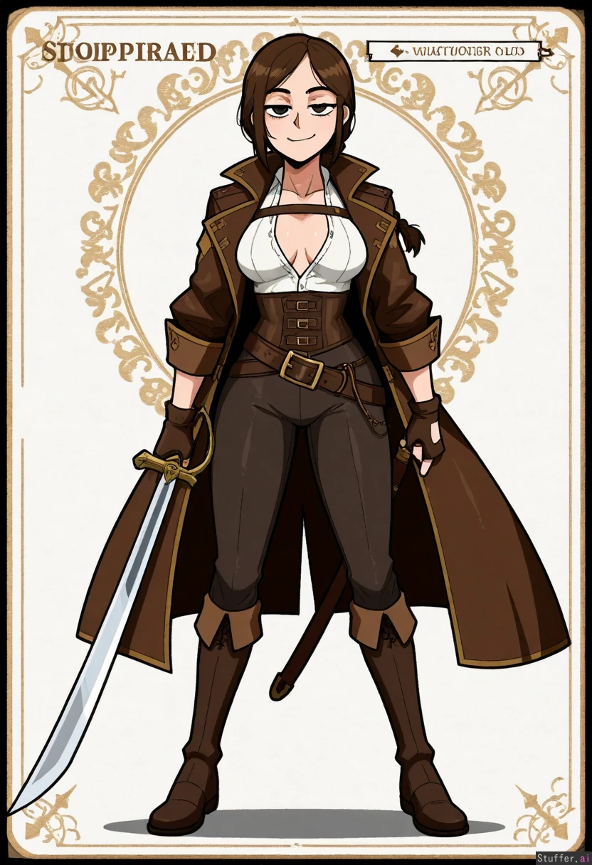 Vanripper, mark gavatino, stopu42 Character concept, simple white background, solo, full body shot, dim colours Fantasy, steampunk, sky pirate, tight white shirt, medium breasts, breasts apart, sword, pistol, greatcoat, Mature woman, mond blond braided hair, beautiful, elegeant facial features, smug, proud