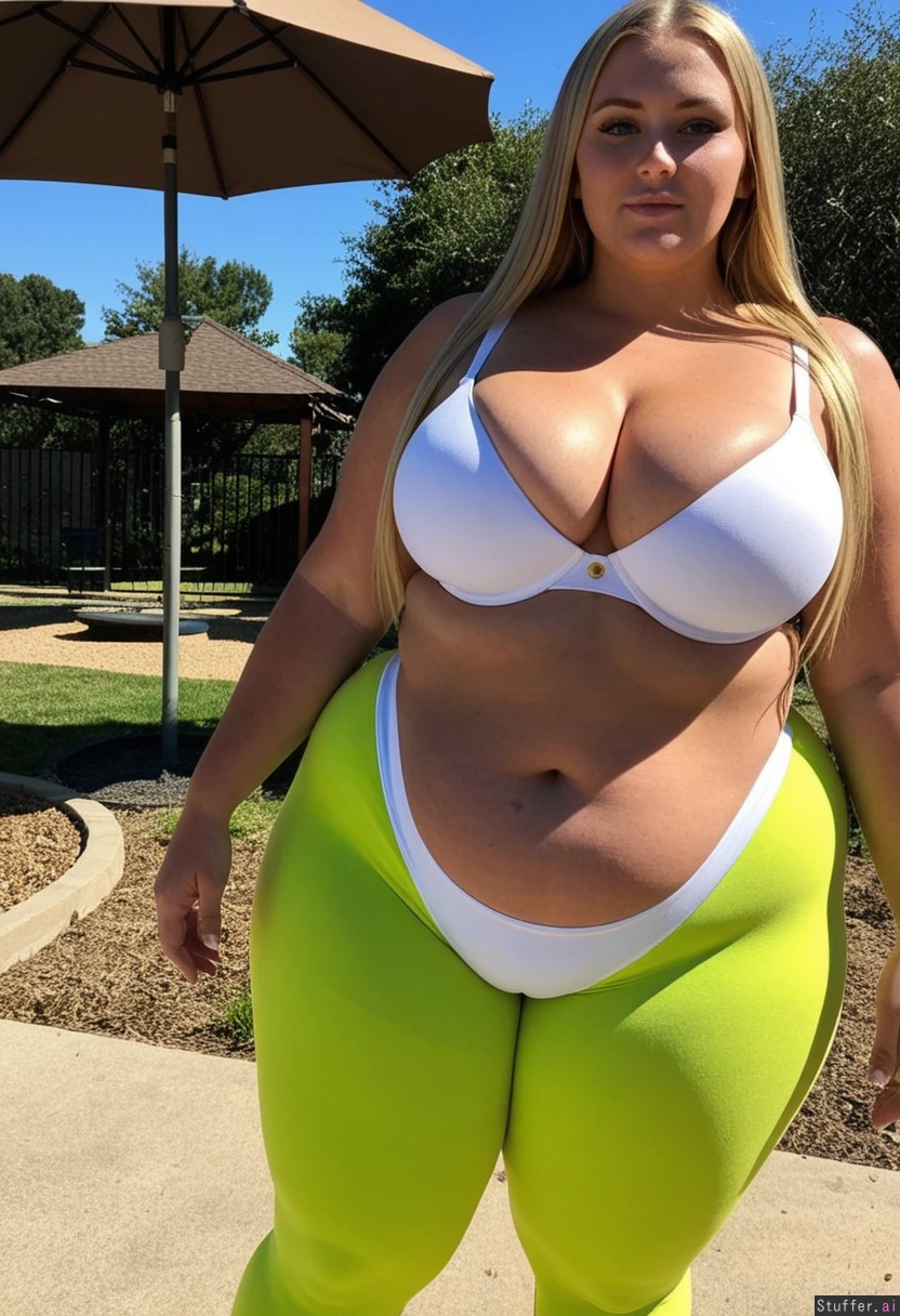 Tall tan woman wearing lime green leggings and white bra Long blonde flowing hair Green eyes Standing outside on sunny day (((Massive cleavage))) (((Very skinny waist))) (((Massive gigantic extremely wide hips))) (((Enormous gigantic rotund hips))) (((Humongous thick massive hips)))