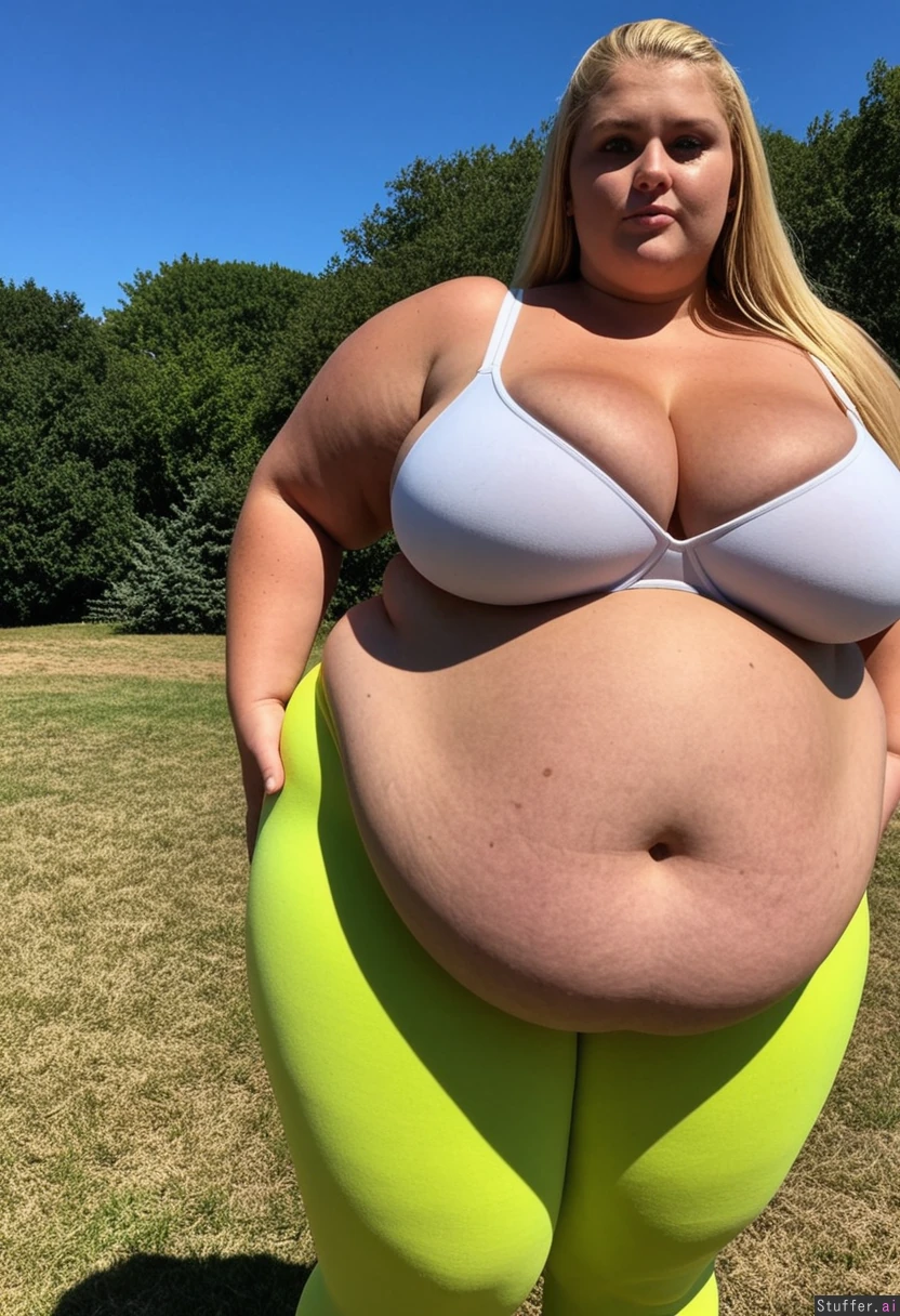 Tall tan woman wearing lime green leggings and white bra Long blonde flowing hair Green eyes Standing alone outside on sunny day (Side profile view) (((Massive cleavage))) (((Large massive fat waist))) (((Massive fat gigantic extremely (mega wide) hips))) (((Enormous fat gigantic (mega rotund) hips))) (((Humongous fat thick massive hips))) (((Obese))) (((Giant belly)))