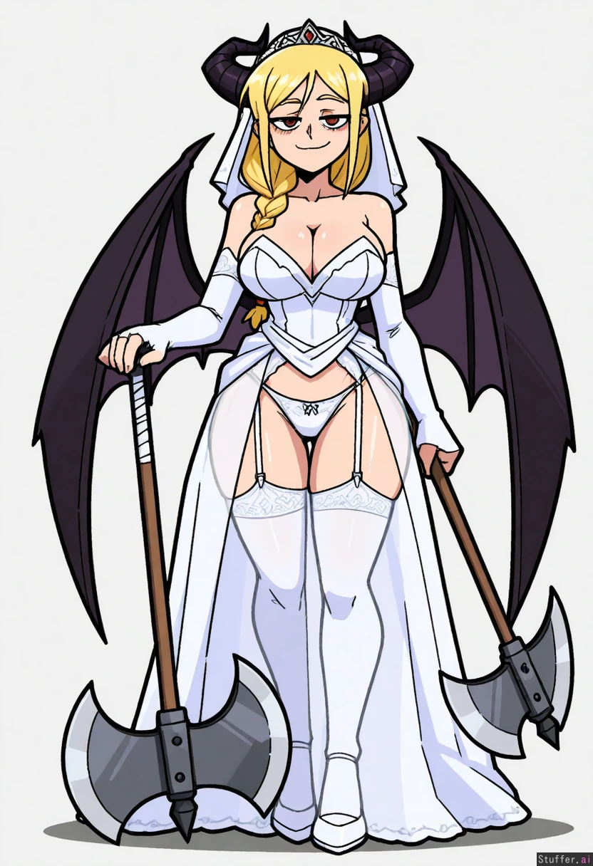 Vanripper, mark gavatino, stopu42 Character concept, simple white background, solo, full body shot, dim colours Fantasy, bride, slutty bridal dress, white laced panties, axe, succubus, bat wings Mature woman, long blond braided hair, beautiful, elegeant facial features, smug, proud