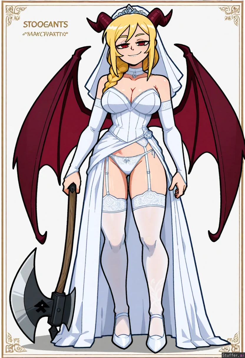 Vanripper, mark gavatino, stopu42 Character concept, simple white background, solo, full body shot, dim colours Fantasy, bride, slutty bridal dress, white laced panties, axe, succubus, bat wings Mature woman, long blond braided hair, beautiful, elegeant facial features, smug, proud