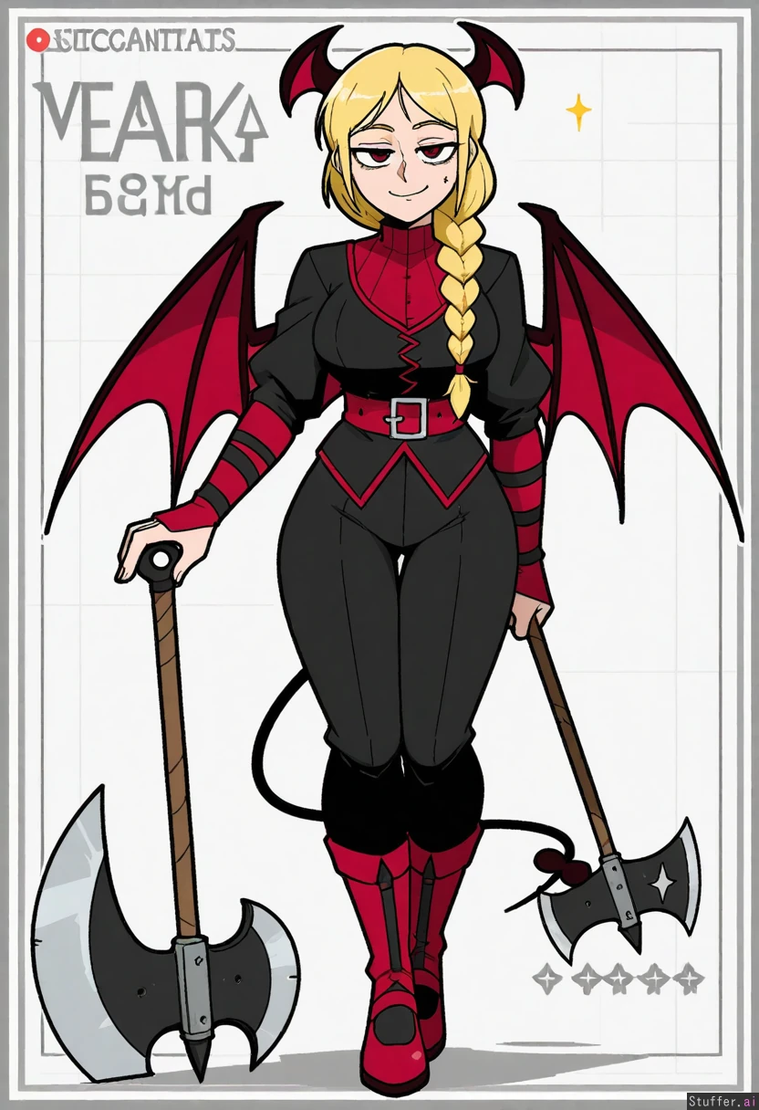 Vanripper, mark gavatino, stopu42 Character concept, simple white background, solo, full body shot, dim colours Fantasy, axe, succubus, bat wings Mature woman, long blond braided hair, beautiful, elegeant facial features, smug, proud