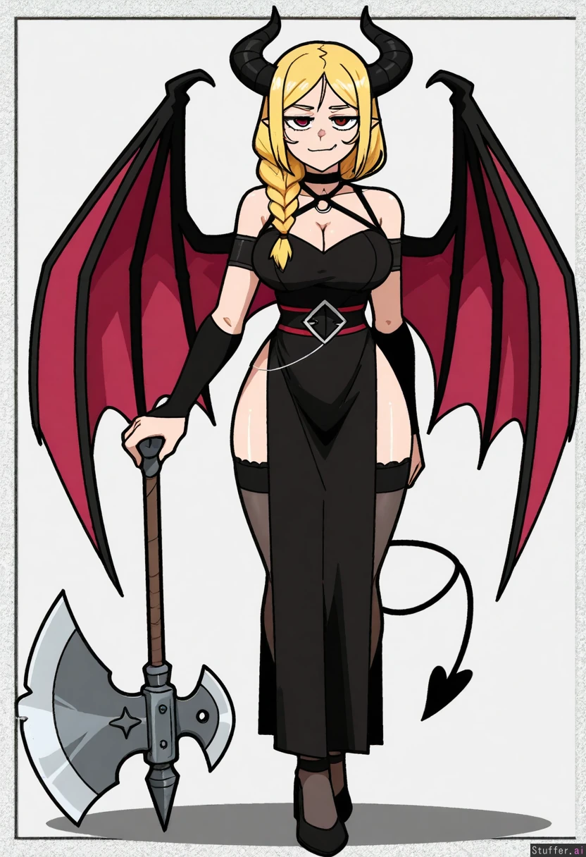 Vanripper, mark gavatino, stopu42 Character concept, simple white background, solo, full body shot, dim colours Fantasy, axe, succubus, bat wings Mature woman, long blond braided hair, beautiful, elegeant facial features, smug, proud