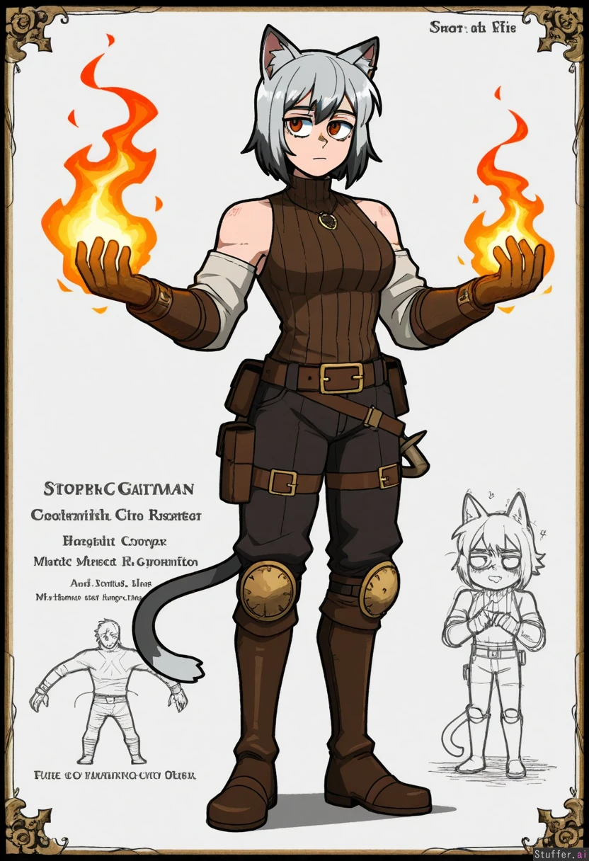 Vanripper, mark gavatino, stopu42 Character concept, simple white background, solo, full body shot, dim colours Fantasy, steampunk, blacksmith, cold and fire magic Cat man, stripped hair, gray hair, adult man, strong, wide shoulders, cat ears
