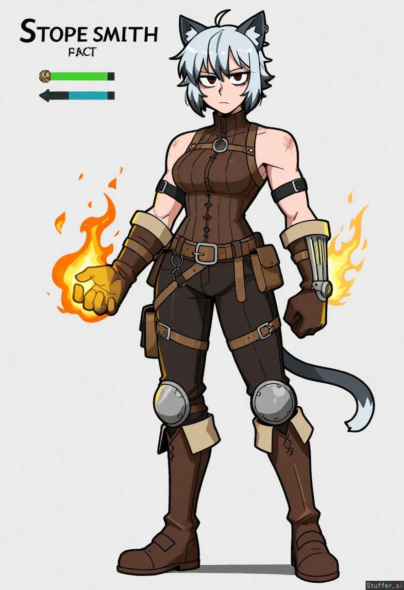 Vanripper, mark gavatino, stopu42 Character concept, simple white background, solo, full body shot, dim colours Fantasy, steampunk, blacksmith, cold and fire magic Cat man, stripped hair, gray hair, adult man, strong, wide shoulders, cat ears