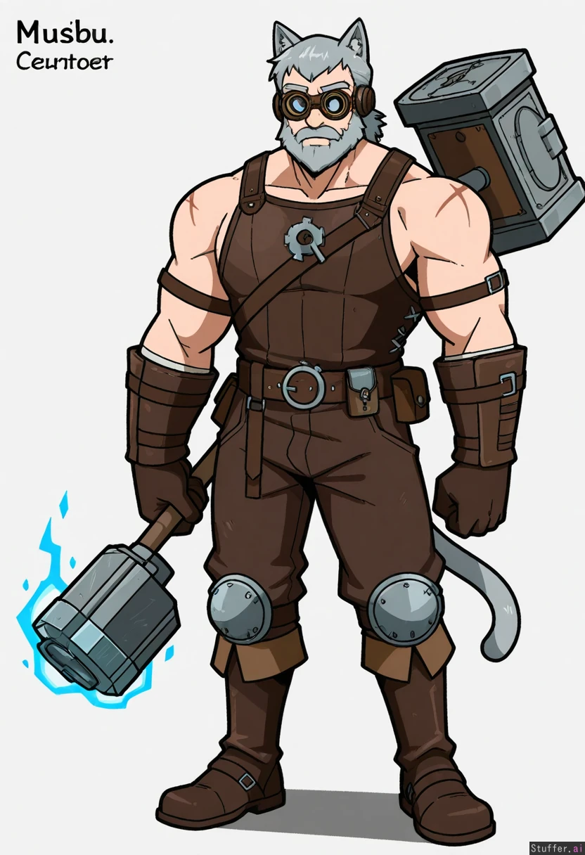 Vanripper, mark gavatino, stopu42 Character concept, simple white background, solo, full body shot, dim colours Fantasy, steampunk, blacksmith, frost and fire magic, hammer, mechanical breastplate, protection googles , stripped hair, gray hair, (adult man:1.2), strong, wide shoulders, cat ears, beard