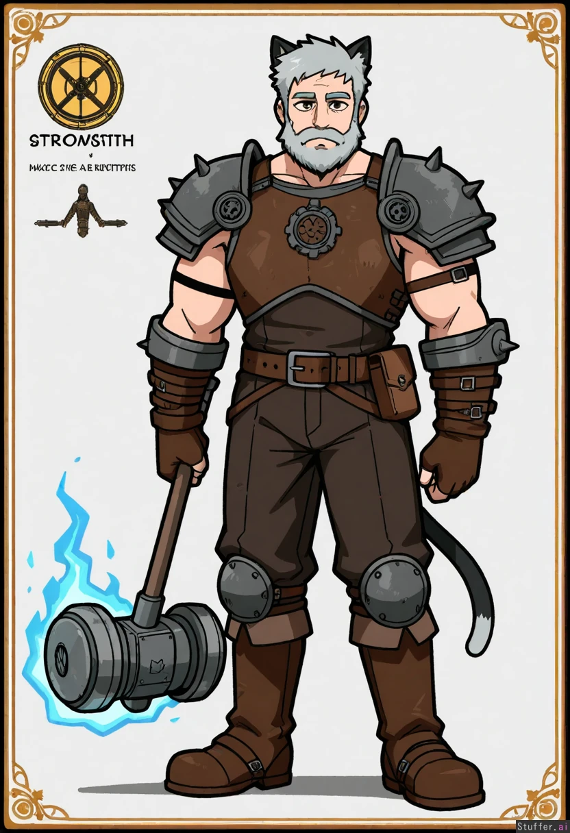 Vanripper, mark gavatino, stopu42 Character concept, simple white background, solo, full body shot, dim colours Fantasy, steampunk, blacksmith, frost and fire magic, hammer, mechanical breastplate, shoulder plates , stripped hair, gray hair, (adult man:1.2), strong, wide shoulders, cat ears, beard