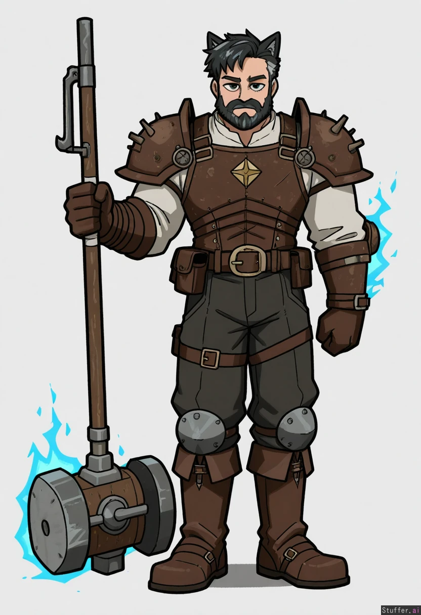 Vanripper, mark gavatino, stopu42 Character concept, simple white background, solo, full body shot, dim colours Fantasy, steampunk, blacksmith, frost and fire magic, hammer, mechanical breastplate, shoulder plates , stripped hair, gray and black streaked hair, (adult man:1.2), strong, wide shoulders, cat ears, beard, kind eyes