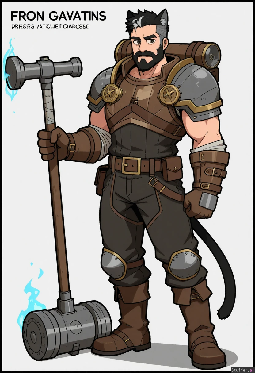 Vanripper, mark gavatino, stopu42 Character concept, simple white background, solo, full body shot, dim colours Fantasy, steampunk, blacksmith, frost and fire magic, hammer, mechanical breastplate, shoulder plates , stripped hair, gray and black streaked hair, (adult man:1.2), strong, wide shoulders, cat ears, beard, kind eyes, cat tail