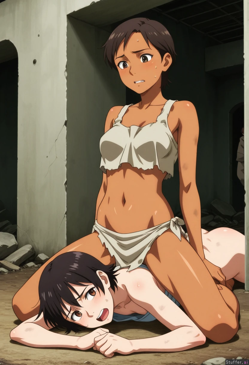 2 girls: Kaia & Tina: Kaia: (dark greasy short hair), 20s (flatchested), (sandy skin), (brown eyes), mature, (Wasteland), ruins, (Hiding in a corner), hunched, (deep navel), (legs in a lazy position), mature, skinny, Captured, perfect_anatomy, detailed_hands, detailed_teeth, dirty, bruised, (nervous), (sighing), (exhausted), Wearing: (tattered rags), ---------- Tina: Woman, (long dark hair), (brown skin), mature, 30s, Wearing: (military outfit), (Buying Kaia from a guard),