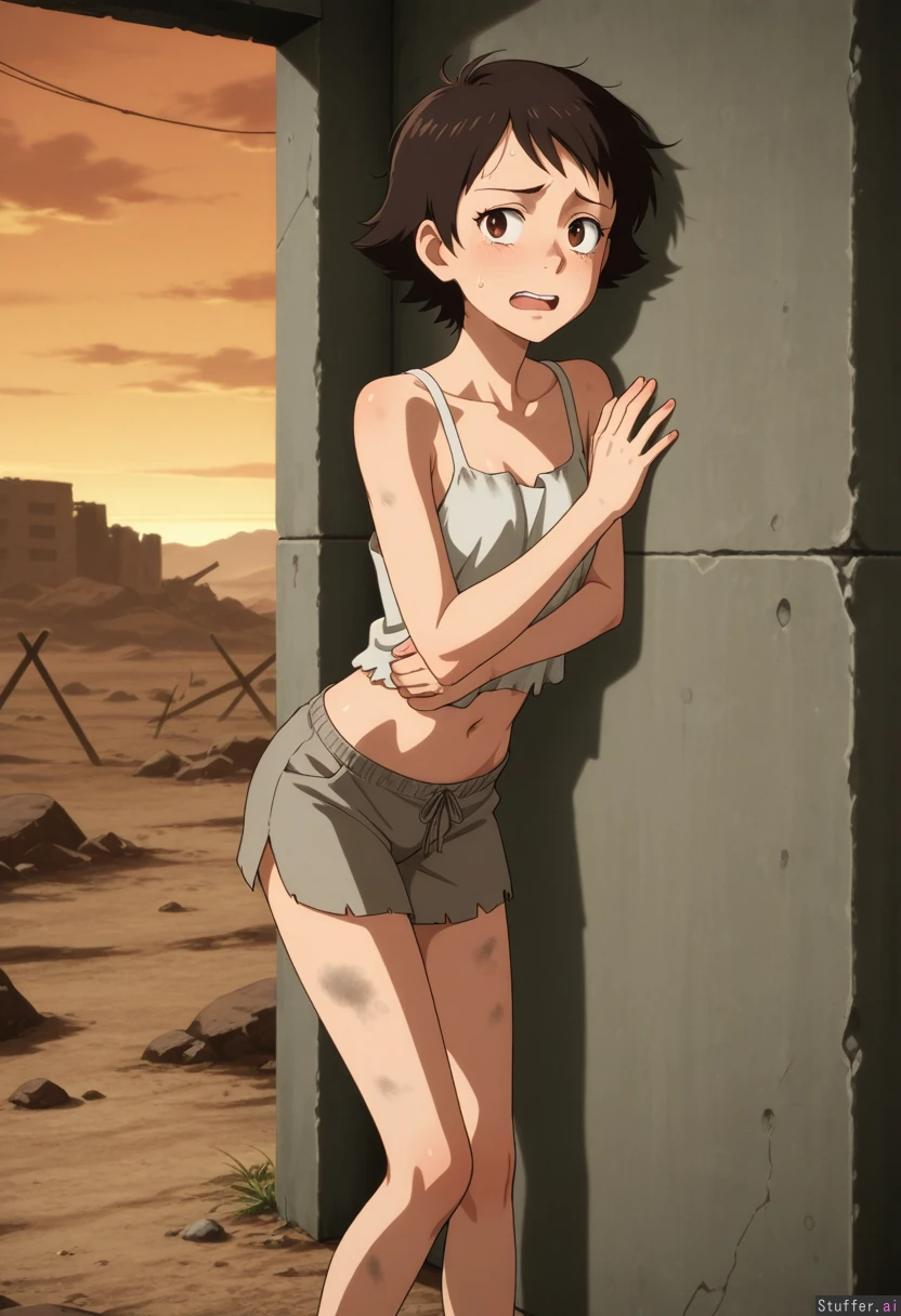 (dark short hair), 20s (flatchested), (sandy skin), (brown eyes), mature, (Wasteland), ruins, (Hiding in a corner), hunched, (deep navel), (legs in a lazy position), mature, skinny, perfect_anatomy, detailed_hands, detailed_teeth, dirty, (nervous), (sighing), (exhausted), Wearing: (tattered rags), chains, Sideview