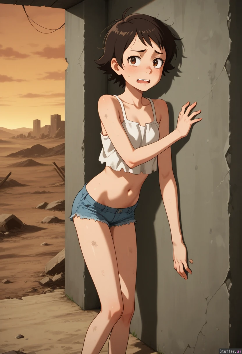 (dark short hair), 20s (flatchested), (sandy skin), (brown eyes), mature, (Wasteland), ruins, (Hiding in a corner), hunched, (deep navel), (legs in a lazy position), mature, skinny, starved, (chubby:0.70), perfect_anatomy, detailed_hands, detailed_teeth, dirty, (nervous), (sighing), (exhausted), Wearing: (tattered rags), chains, Sideview