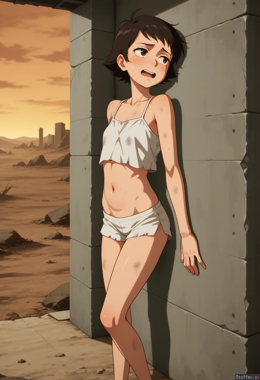 (dark short hair), 20s (flatchested), (sandy skin), (brown eyes), mature, (Wasteland), ruins, (Hiding in a corner), hunched, (deep navel), (legs in a lazy position), mature, skinny, starved, (chubby:0.70), perfect_anatomy, detailed_hands, detailed_teeth, dirty, (nervous), (sighing), (exhausted), Wearing: (tattered rags), Sideview