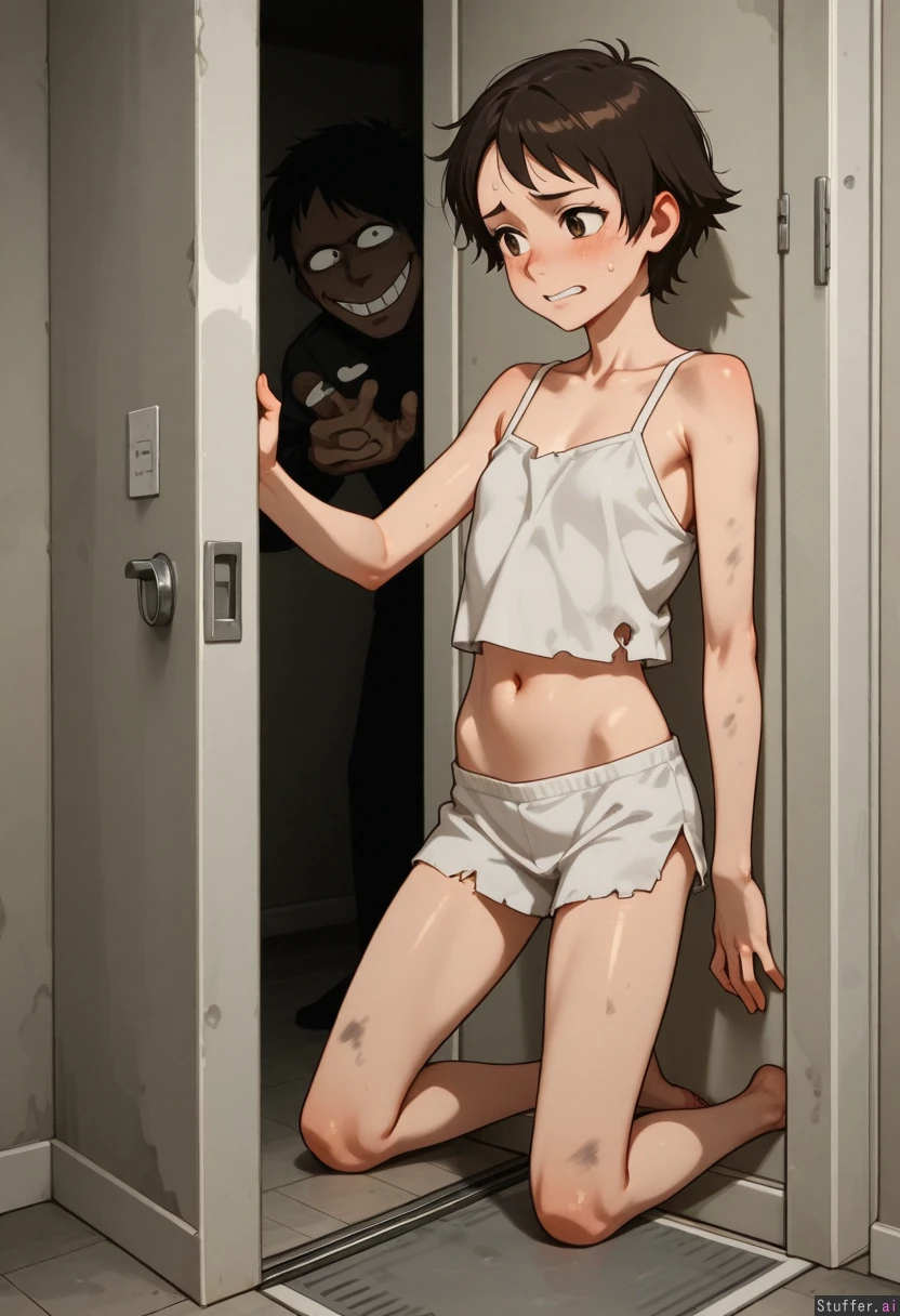 (dark short hair), 20s (flatchested), (sandy skin), (brown eyes), mature, (Pantry), (Hiding in a corner), hunched, (deep navel), (legs in a lazy position), mature, skinny, starved, (chubby:0.00), perfect_anatomy, detailed_hands, detailed_teeth, dirty, (nervous), (sighing), (exhausted), smiling, Wearing: (tattered rags), Sideview