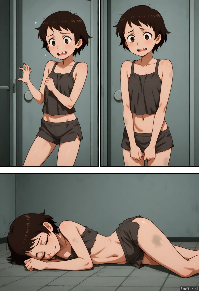 (dark short hair), 20s (flatchested), (sandy skin), (brown eyes), mature, (Pantry), Hunched, (deep navel), (legs in a lazy position), mature, skinny, starved, (chubby:0.00), perfect_anatomy, detailed_hands, detailed_teeth, dirty, (nervous), (sighing), (exhausted), smiling, Wearing: (tattered rags), Sideview