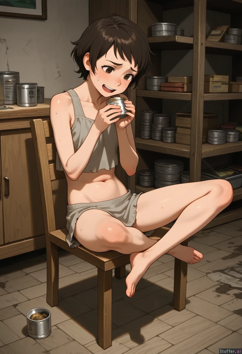 (dark short hair), 20s (flatchested), (sandy skin), (brown eyes), mature, (Pantry), (canned food), chair, Sitting, Hunched, (deep navel), (legs in a lazy position), mature, skinny, starved, (chubby:0.00), perfect_anatomy, detailed_hands, detailed_teeth, dirty, (nervous), (sighing), (exhausted), smiling, eating, Wearing: (tattered rags), Sideview
