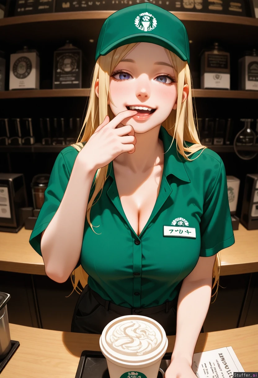 (exquisite quality, extremely detailed, realistic style, masterpiece, absurdres, solo, one girl, front torso view). An attractive Starbucks barista serving at the bar, relaxed pose. Wearing a green polo. Cleavage. Wearing black pants. (Starbucks employee outfit). Beautiful blonde hair. Beautiful deep blue eyes. Cute snub nose. Smiling, happy, good vibes. 20 years old, (force-feeding weight-gain porn), (every day has become rich men are over-feeding her to make her gain weight!)