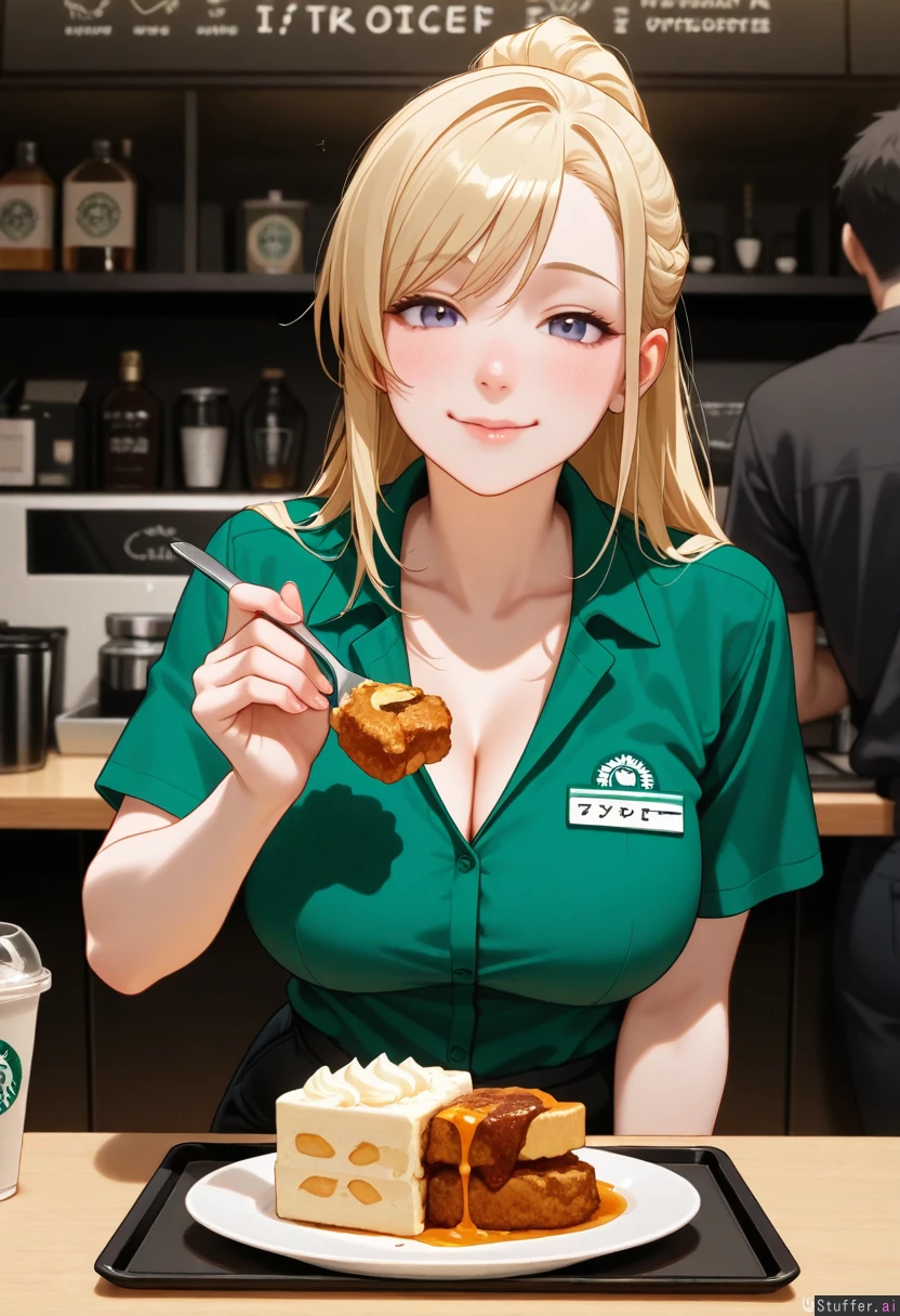 (exquisite quality, extremely detailed, realistic style, masterpiece, absurdres, front torso view). An attractive Starbucks barista serving at the bar, relaxed pose. Wearing a green polo. Cleavage. Wearing black pants. (Starbucks employee outfit). Beautiful blonde hair. Beautiful deep blue eyes. Cute snub nose. Smiling, happy, good vibes. 20 years old, her figure is growing. ((rich male customers forcing her to eat a lot of fattening food including cake, fried pork, cheese!)) , (force-feeding weight-gain porn), ((every day has become rich men are over-feeding her to make her gain weight!))