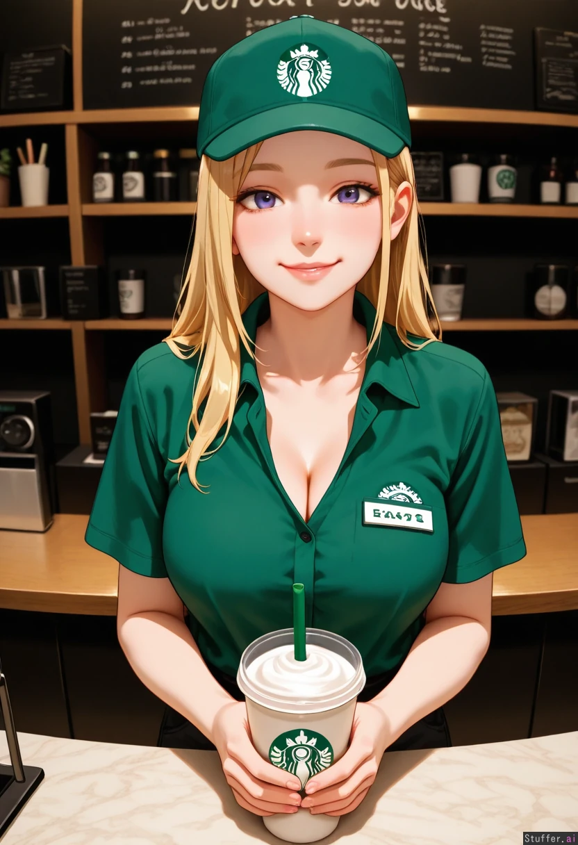 (exquisite quality, extremely detailed, realistic style, masterpiece, absurdres, solo, one girl, front torso view). An attractive Starbucks barista serving at the bar, relaxed pose. Wearing a green polo. Cleavage. Wearing black pants. (Starbucks employee outfit). Beautiful blonde hair. Beautiful deep blue eyes. Cute snub nose. Smiling, happy, good vibes. 20 years old,