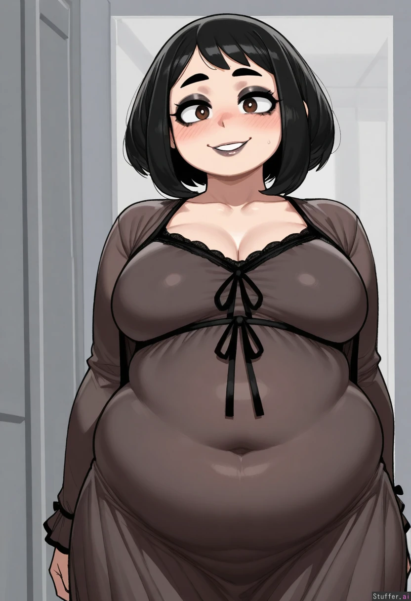 (( 1girl, solo, krekkov)) (( ochako_uraraka)) (( Black_hair, big_lips, black_lipstick, black_eyeshadow, smiling, brown_eyes, heavy_blush, black_nightgown,)) (( chubby_belly:1.5))
