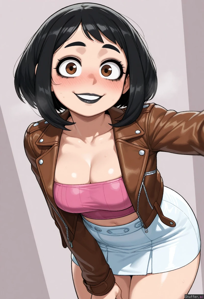(( 1girl, solo, krekkov)) (( ochako_uraraka)) (( Black_hair, big_lips, black_lipstick, black_eyeshadow, smiling, brown_eyes, heavy_blush)) (( leather_jacket, brown_jacket, pink_tube_top, white_skirt, short_skirt))