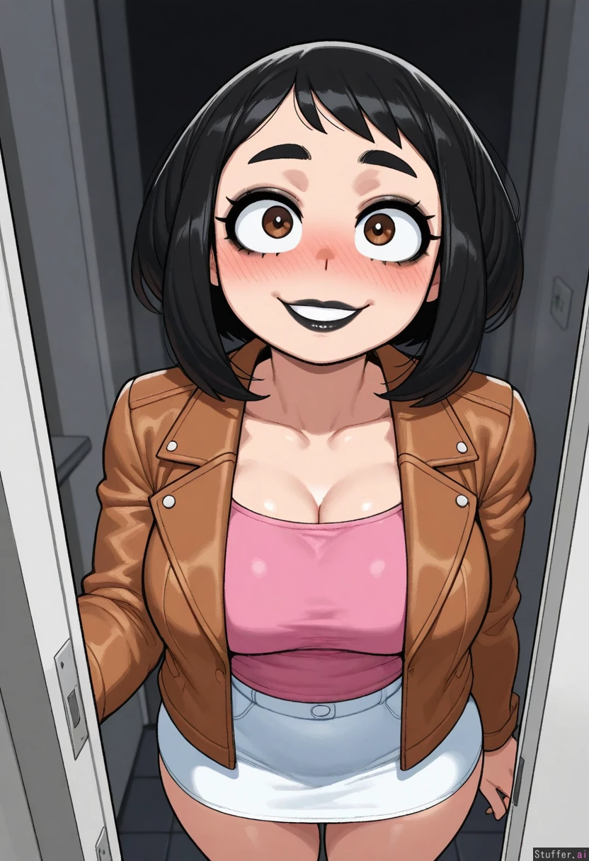 (( 1girl, solo, krekkov)) (( ochako_uraraka)) (( Black_hair, big_lips, black_lipstick, black_eyeshadow, smiling, brown_eyes, heavy_blush)) (( leather_jacket, brown_jacket, pink_tube_top, white_skirt, short_skirt, chubby_belly:0.8)) (( doorway))
