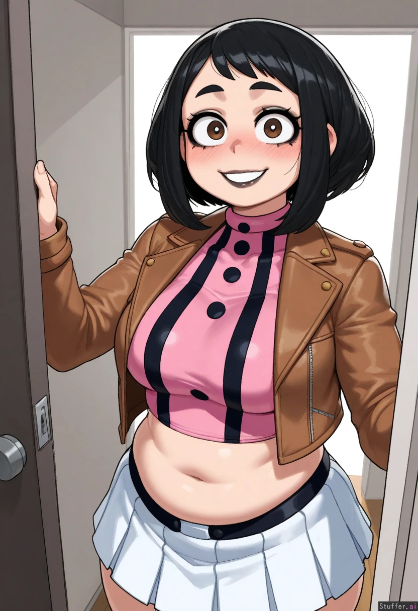 (( 1girl, solo, krekkov)) (( ochako_uraraka)) (( Black_hair, big_lips, black_lipstick, black_eyeshadow, smiling, brown_eyes, heavy_blush)) (( leather_jacket, dark_brown_jacket, pink_tube_top, white_skirt, short_skirt, chubby_belly:0.8)) (( doorway))
