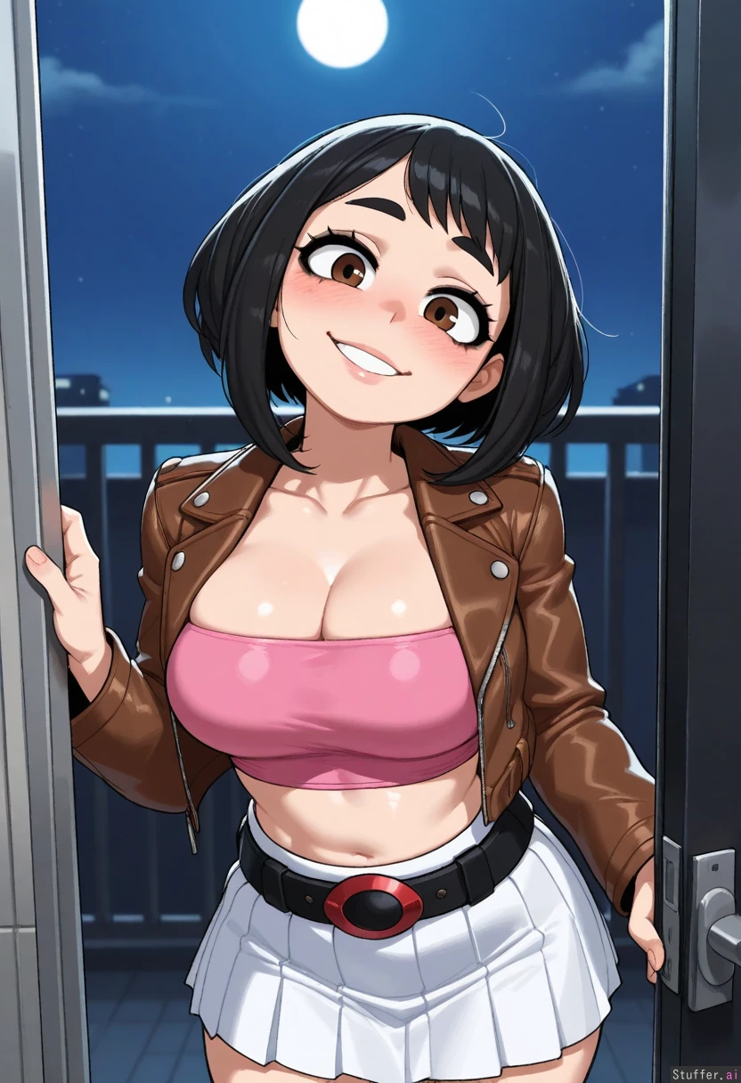 (( 1girl, solo, krekkov)) (( ochako_uraraka)) (( (((Black_hair))), big_lips:1.4, black_eyeshadow, smiling, brown_eyes, heavy_blush)) (( leather_jacket, dark_brown_jacket, pink_top, tube_top, white_skirt, short_skirt, cleavage, black_belt)) (( Chubby_belly:0.8)) (( doorway, head_tilt, moonlight, night_sky))