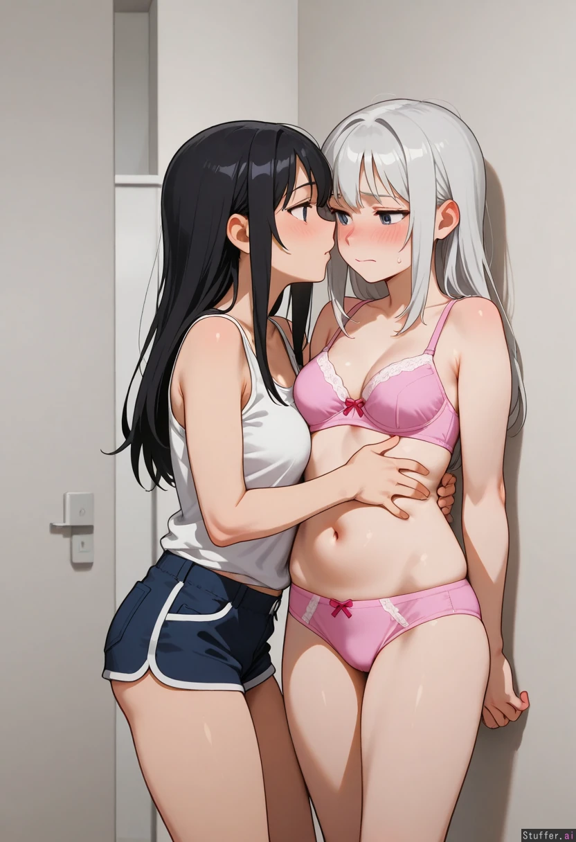Lesbian_couple, Yuri, grabbing_belly, black_hair, tease, silver_hair, embarrassed, ((chubby_belly:0.5))
