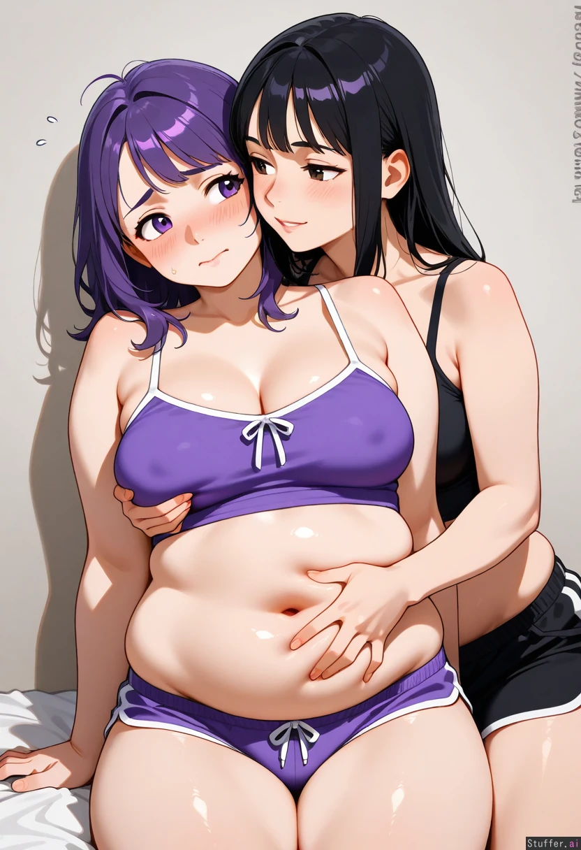 Lesbian_couple, Yuri, grabbing_belly, ((black_hair, aroused, chubby_belly: 0.7)), ((purple_hair, embarrassed, chubby_belly:1.0))
