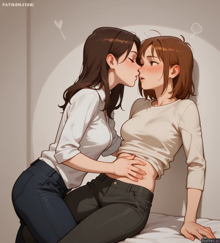 Lesbian_couple, Yuri, grabbing_belly, ((pink_hair, aroused, chubby_belly: 0.0)), ((green_hair, embarrassed, chubby_belly: 0.4))