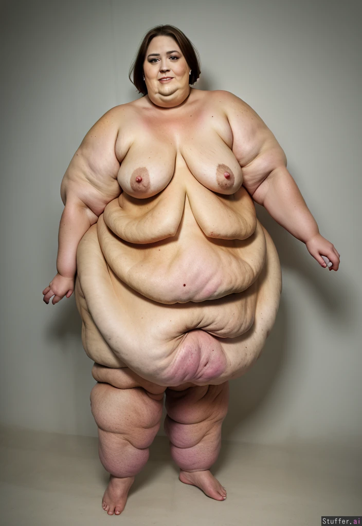 Photo realistic, highly detailed, realistic lighting, ssbbw, standing, beautiful face, (naked:1.4) , (ultra double chin:1.8), (ultra fat face:1.8), ultra huge arms:1.9), (ultra huge legs:1.9), (ultra leg rolls:1.5), (ultra huge calves:1.8), (cellulite:1.5), bare feet:1.4