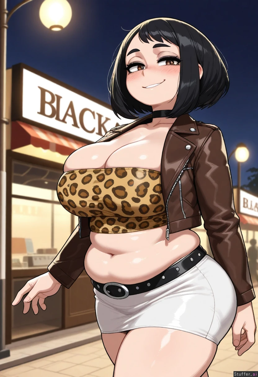 (( 1girl, solo, krekkov)) (( ochako_uraraka)) (( (((Black_hair))), black_eyeshadow, brown_eyes, heavy_blush)) (( leather_jacket, dark_brown_jacket, leopard_print_top, tube_top, white_skirt, short_skirt, cleavage, black_belt)) (( Chubby_belly:1.2)) (( Restaurant, walking, night, warm_lighting, choker, smirk, hakf_closed_eyes, ((back_view, looking_back_at_viewer, ass_visible_from_front))
