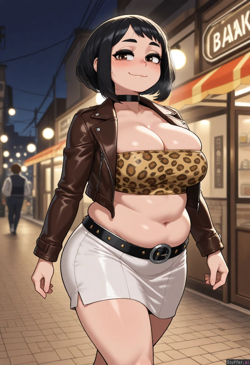 (( 1girl, solo, krekkov)) (( ochako_uraraka)) (( (((Black_hair))), black_eyeshadow, brown_eyes, heavy_blush)) (( leather_jacket, dark_brown_jacket, leopard_print_top, tube_top, white_skirt, short_skirt, cleavage, black_belt)) (( Chubby_belly:1.2)) (( Restaurant, walking, night, warm_lighting, choker, smirk, hakf_closed_eyes, ((((back_view, looking_back_at_viewer))))