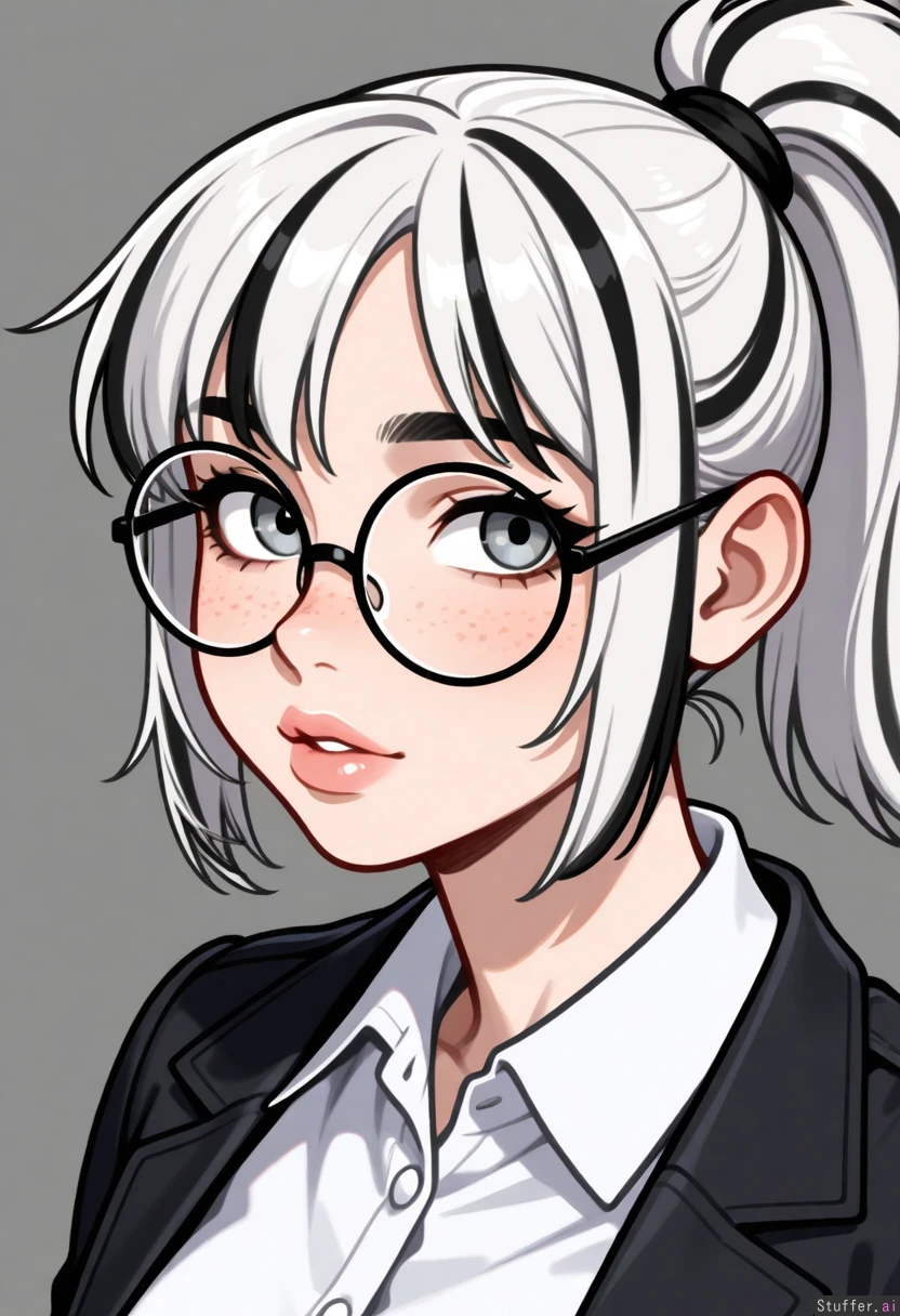 (( solo, 1girl, bushyspicy)) (( white_hair, black_highlights, high_ponytail, grey_eyes, round_glasses, big_lips, freckles