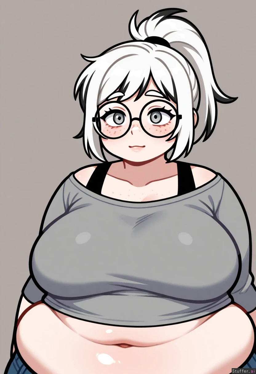 (( solo, 1girl, bushyspicy)) (( white_hair, black_highlights, high_ponytail, grey_eyes, round_glasses, freckles)) (( Obese_belly:1.0))