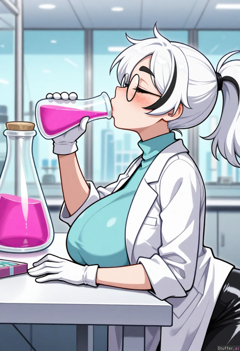 (( solo, 1girl, bushyspicy)) (( Adult, white_hair, black_highlights, high_ponytail, grey_eyes, round_glasses, freckles, black_eyebrows)) (( labcoat, light_blue_shirt, turtleneck_shirt,leather_skirt, white_gloves)) (( Gigantic_breasts:0.9)) (( laboratory, white_table, pink_potion, holding_pink_potion, drinking, side_profile, side_view, closed_eyes, head_back, heavy_blush))