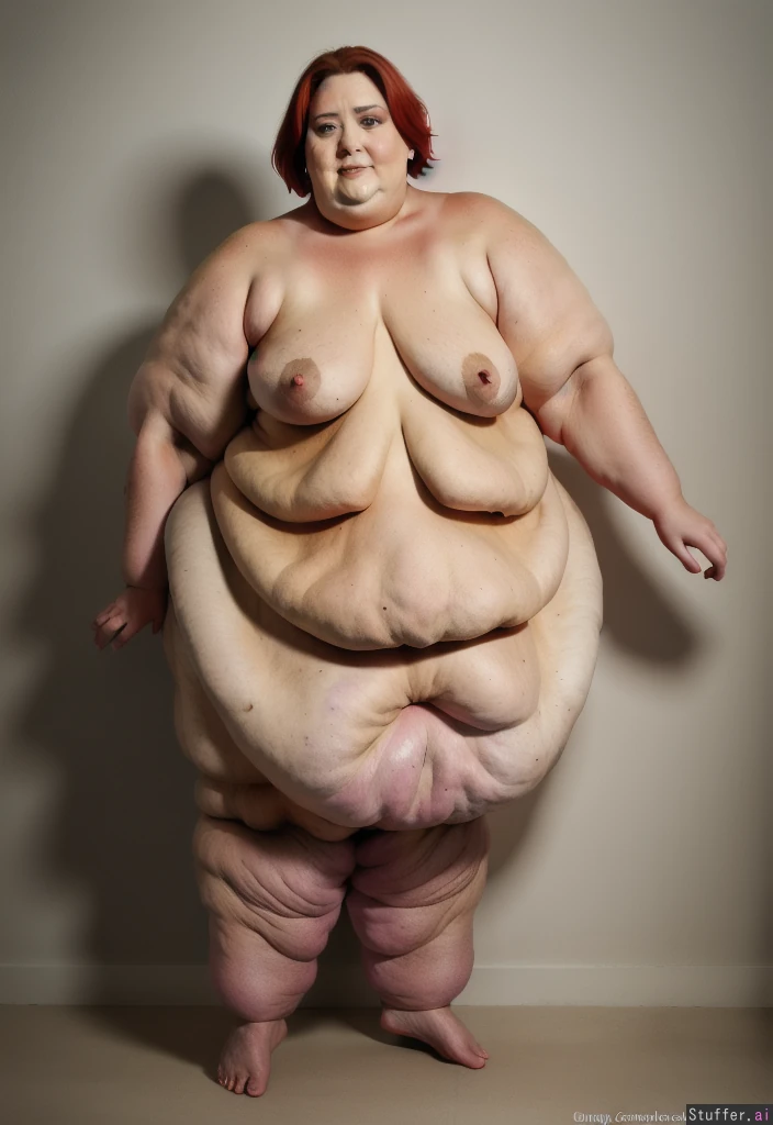 Photo realistic, highly detailed, realistic lighting, ssbbw, standing, beautiful face, (short hair red hair:1.4), (naked:1.4) , (ultra double chin:1.8), (ultra fat face:1.9), ultra huge arms:1.9), (ultra huge legs:1.9), (ultra leg rolls:1.5), (ultra huge calves:1.8), (cellulite:1.5), bare feet:1.4
