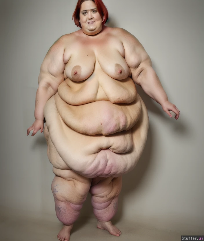 Photo realistic, highly detailed, realistic lighting, ssbbw, standing, beautiful face, (short hair red hair:1.4), (naked:1.4) , (ultra double chin:1.8), (ultra fat face:1.9), ultra huge arms:1.9), (ultra huge legs:1.9), (ultra leg rolls:1.5), (ultra huge calves:1.8), (cellulite:1.5), bare feet:1.4
