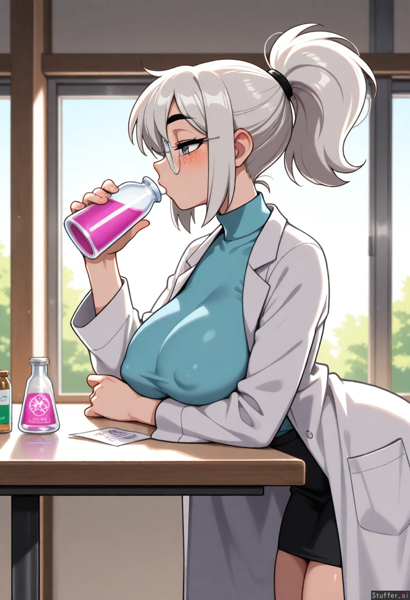 (( solo, 1girl, bushyspicy)) (( Adult, white_hair, black_highlights, medium_hair, grey_eyes, freckles, black_eyebrows, high_ponytail)) (( Large_breasts:1.3)) (( Thick_thighs:0.85)) ((Laboratory, daylight, morning, windows, DAY)) (( Black_skirt, labcoat, turtleneck_shirt, light_blue_shirt)) (( ((Side_view, side_profile)), standing, round_glasses, silver_glasses, nipple_outline, white_table, ((pink_potion)), holding_pink_potion, drinking, leaning_on_table, half-closed_eyes))