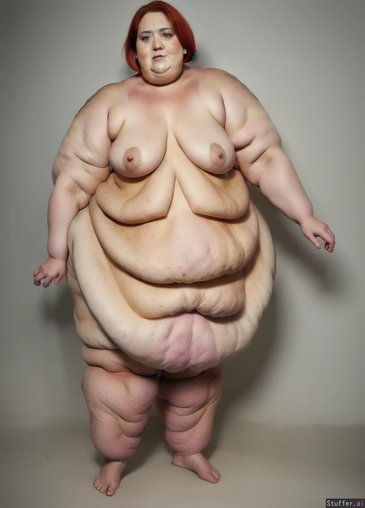 Photo realistic, highly detailed, realistic lighting, ssbbw, standing, beautiful face, (short hair red hair:1.4), (naked:1.4) , (ultra double chin:1.8), (ultra fat face:1.9), ultra huge arms:1.9), (ultra huge legs:1.9), (ultra leg rolls:1.5), (ultra huge calves:1.8), (cellulite:1.5), bare feet:1.4