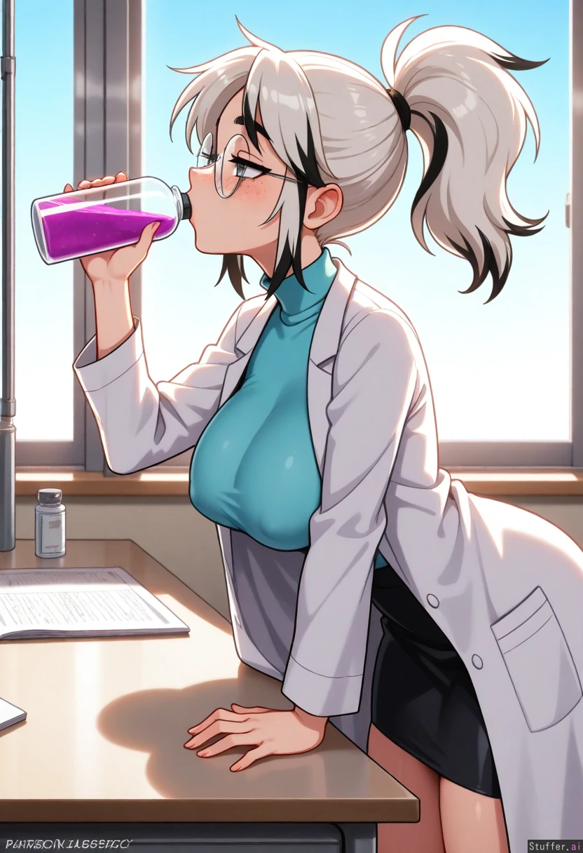 (( solo, 1girl, bushyspicy)) (( Adult, white_hair, black_highlights, medium_hair, grey_eyes, freckles, black_eyebrows, high_ponytail)) (( Large_breasts:1.3)) (( Thick_thighs:0.85)) ((Laboratory, daylight, morning, windows, DAY)) (( Black_skirt, labcoat, turtleneck_shirt, light_blue_shirt)) (( ((Side_view, side_profile)), standing, round_glasses, silver_glasses, nipple_outline, white_table, ((pink_potion)), holding_pink_potion, drinking, leaning_on_table, half-closed_eyes, head_back