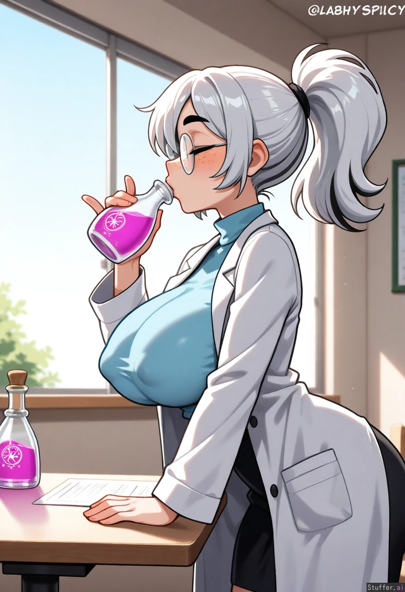 (( solo, 1girl, bushyspicy)) (( Adult, white_hair, black_highlights, medium_hair, grey_eyes, freckles, black_eyebrows, high_ponytail)) (( Large_breasts:1.3)) (( Thick_thighs:0.85)) ((Laboratory, daylight, morning, windows, DAY)) (( Black_skirt, labcoat, turtleneck_shirt, light_blue_shirt)) (( ((Side_view, side_profile)), standing, round_glasses, silver_glasses, nipple_outline, white_table, ((pink_potion)), holding_pink_potion, drinking, leaning_on_table, closed_eyes, head_back))