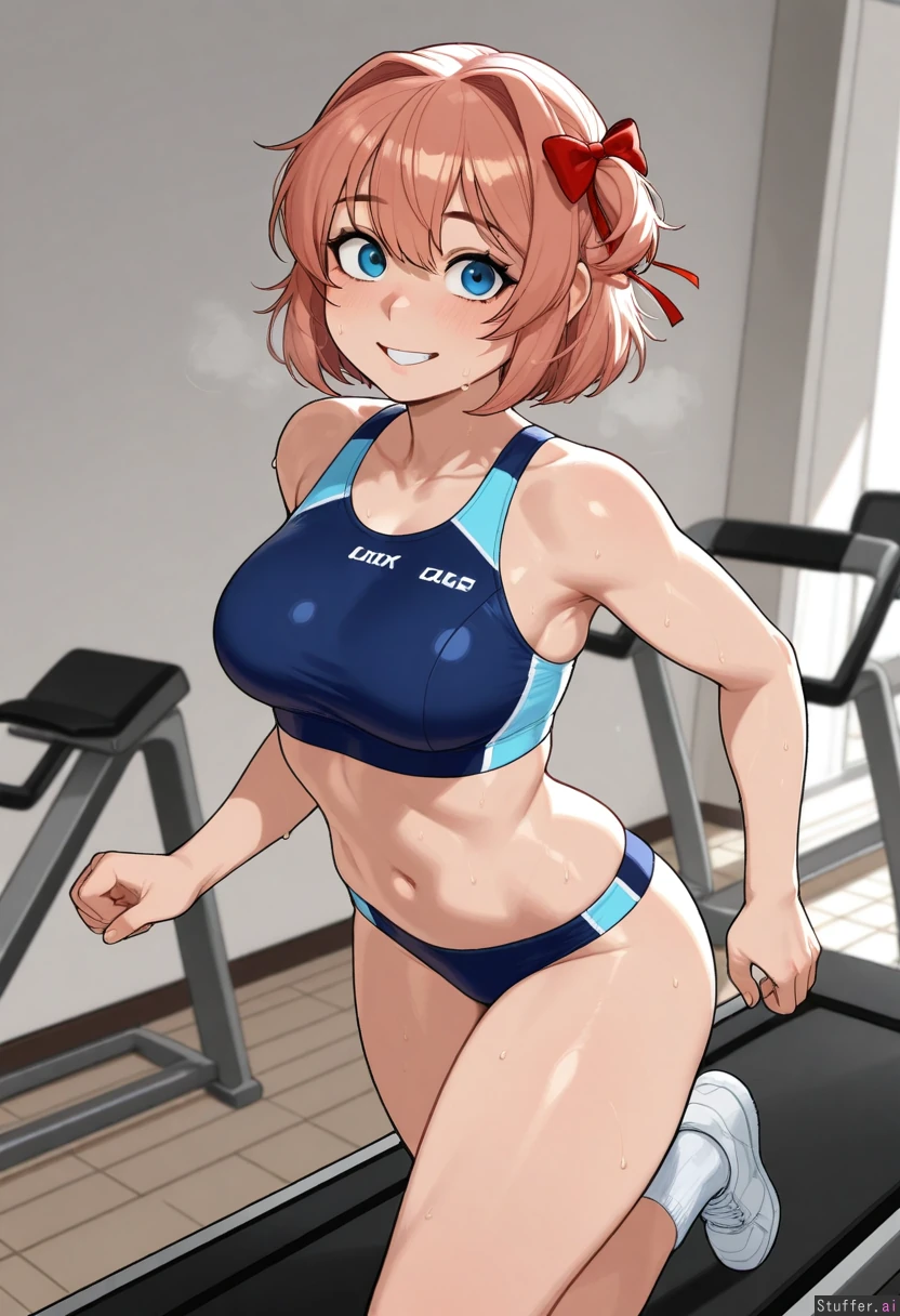 krekkov(artists), KAMII MOMORU(artist) beautiful shading, highly detailed, best quality, perfect anatomy, perfect proportions, perfect lighting, Solo, (cute face), Sayori from Doki Doki Literature Club, blue eyes, mascara, tight sports bikini, (Fitness centre), (Running on a treadmill), (sweaty), (skinny body: 1.0), (massive flattering belly, potbelly: 0.0), (medium breasts:1.0), (Soft belly: 0.0), (Bloated belly: 0.0),